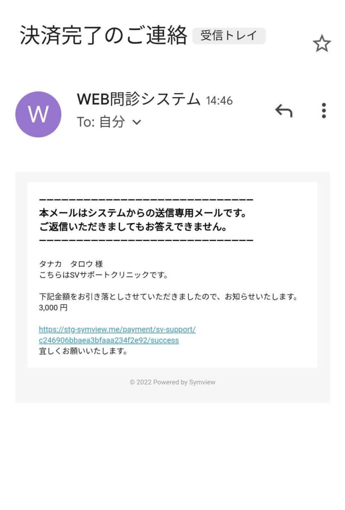 当院での決済処理が完了すると、自動的に「決済完了メール」が届きます。メール内のURLをクリックするだけで、その日のお支払い額がすぐに表示されます。